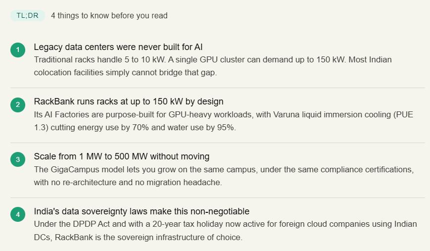 Colocation used to be about renting a rack in a building with good connectivity and a diesel generator backup. That era is over. The question now is whether your infrastructure can sustain 150 kW per rack, run at PUE 1.3, guarantee data sovereignty, and scale from 1 MW to 500 MW without requiring you to move. RackBank’s 300 MW+ West-East AI Factory corridor, GigaCampus architecture, and certified sovereign infrastructure are built specifically for that question.